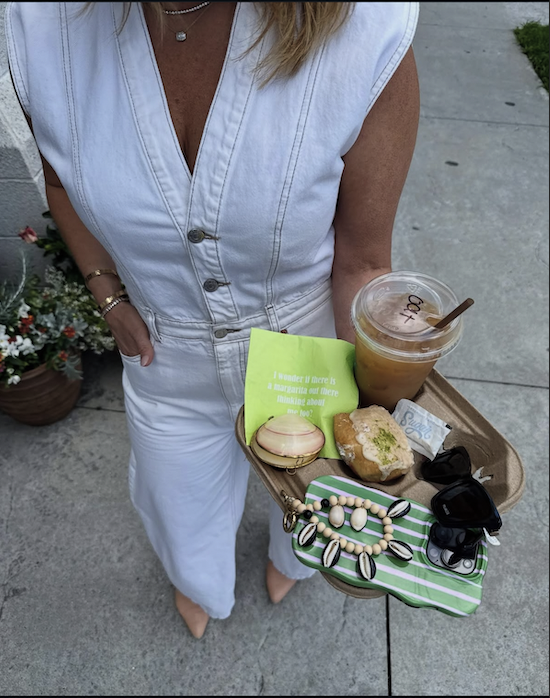 Copy: Don’t worry, I have everything I need 💚What are your “can’t leave the house without” essentials? Here are ours: • a cute pair of @quay sunnies• lip balm (our current fav is @earthtuface seashell lip balm—perfectly beachy!) • phone with a @louvini phone charm strap (we can’t help but accessorize our phones, plus we never lose them) • and a napkin that says exactly what we’re thinking! While we’re out we stop at @isabelsavalon to get an iced coffee and at @highdunebaking for a sweet treat (still thinking about the Margarita cream donut—so good!)