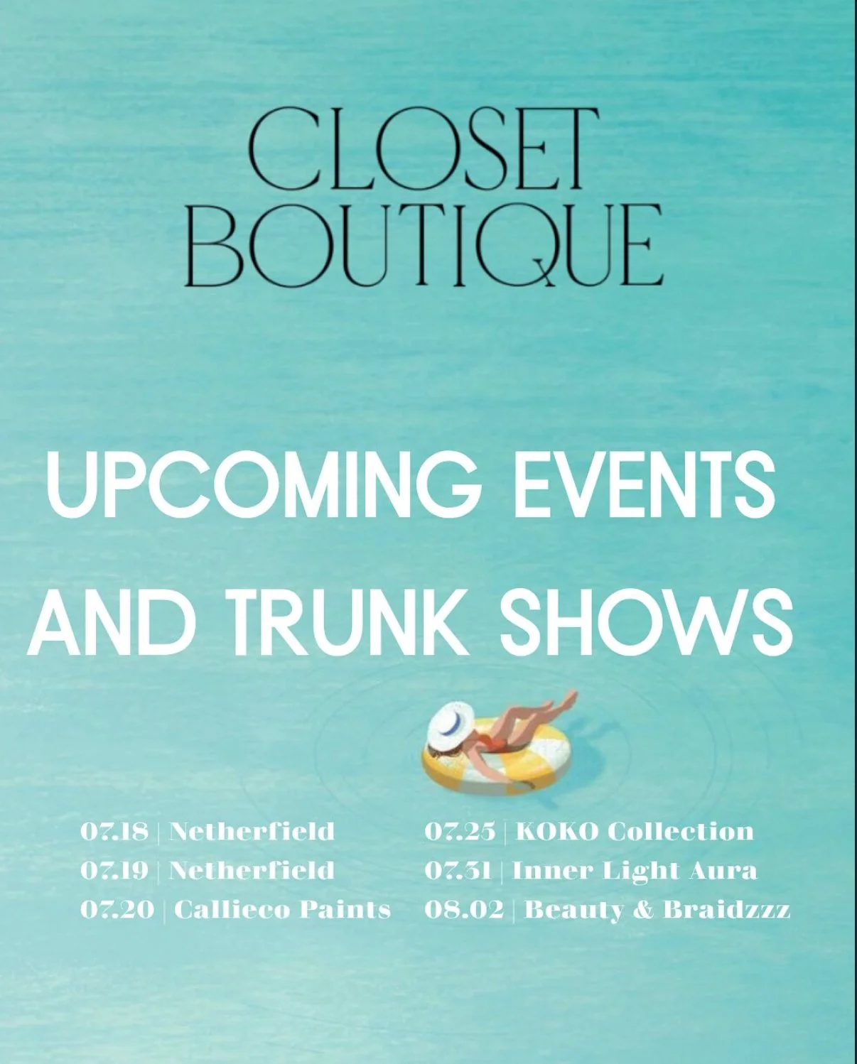 This summer, we are celebrating our 20th year in business. The Closet is soon to become your closet, elevating your wardrobe one piece at a time :) Stop by and see all of our goodies—open from 10 to 8 daily.